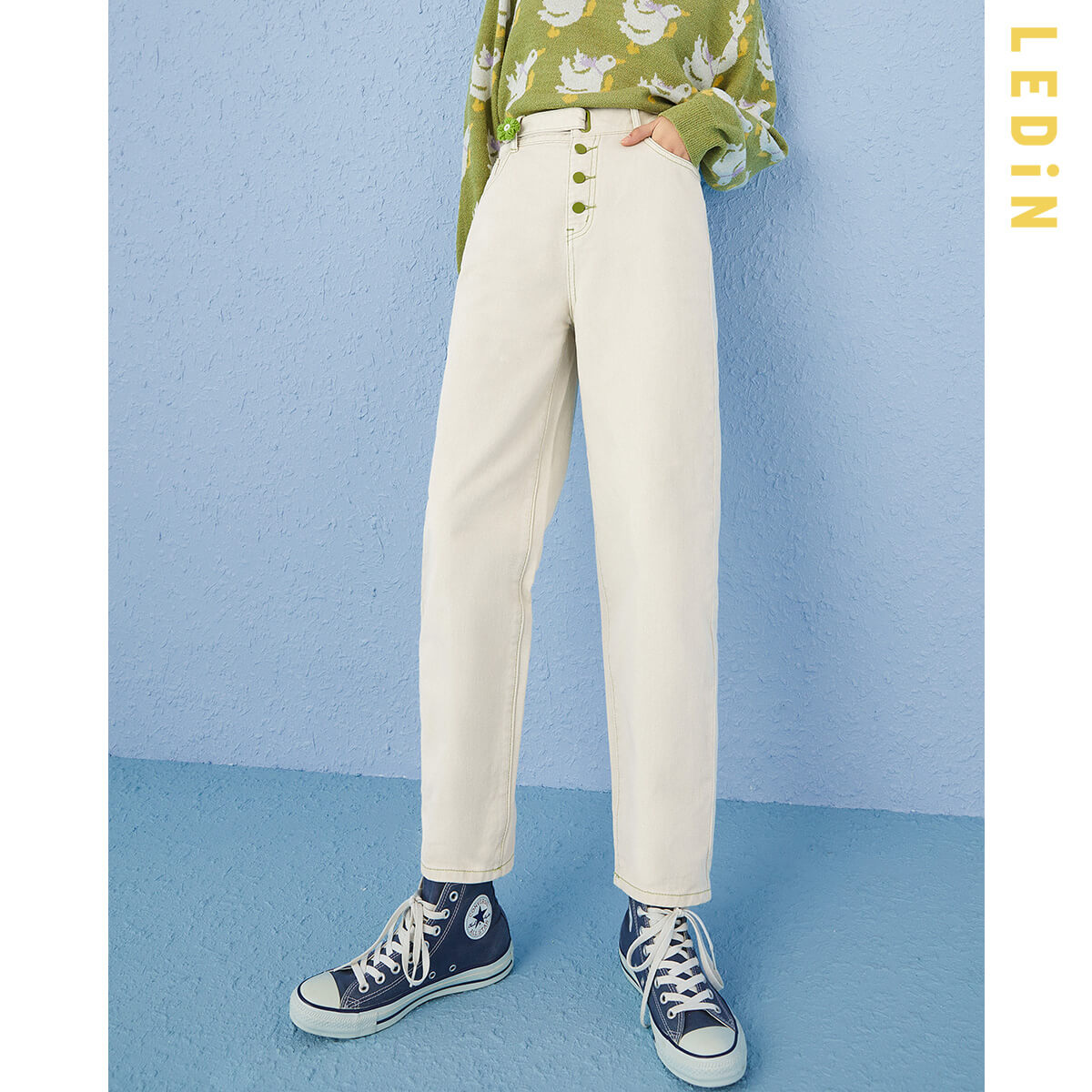 直筒牛仔褲女2021年春季新款褲子女裝童趣花花牛仔褲寬鬆